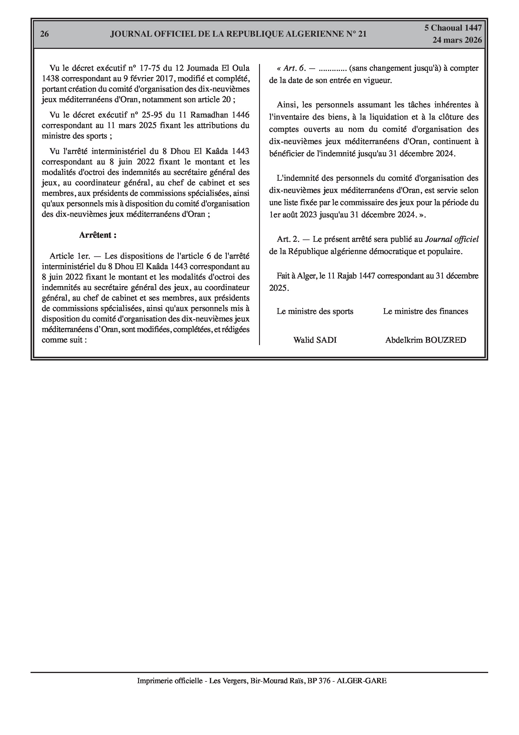Nominations dans plusieurs ministères et ajustements des indemnités des Jeux Méditerranéens.