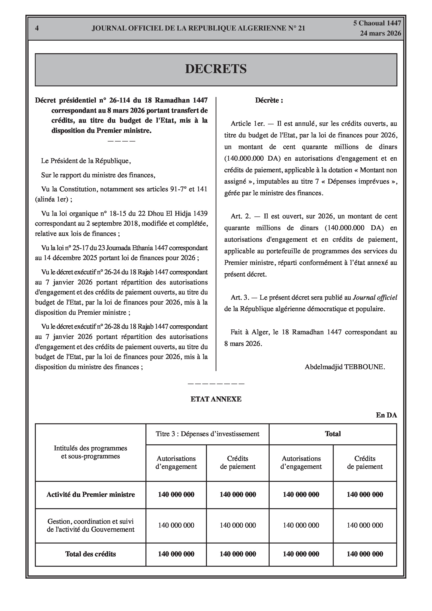 Transfert de 140 millions de DA en autorisations d'engagement et crédits de paiement pour l'activité du Premier ministre.