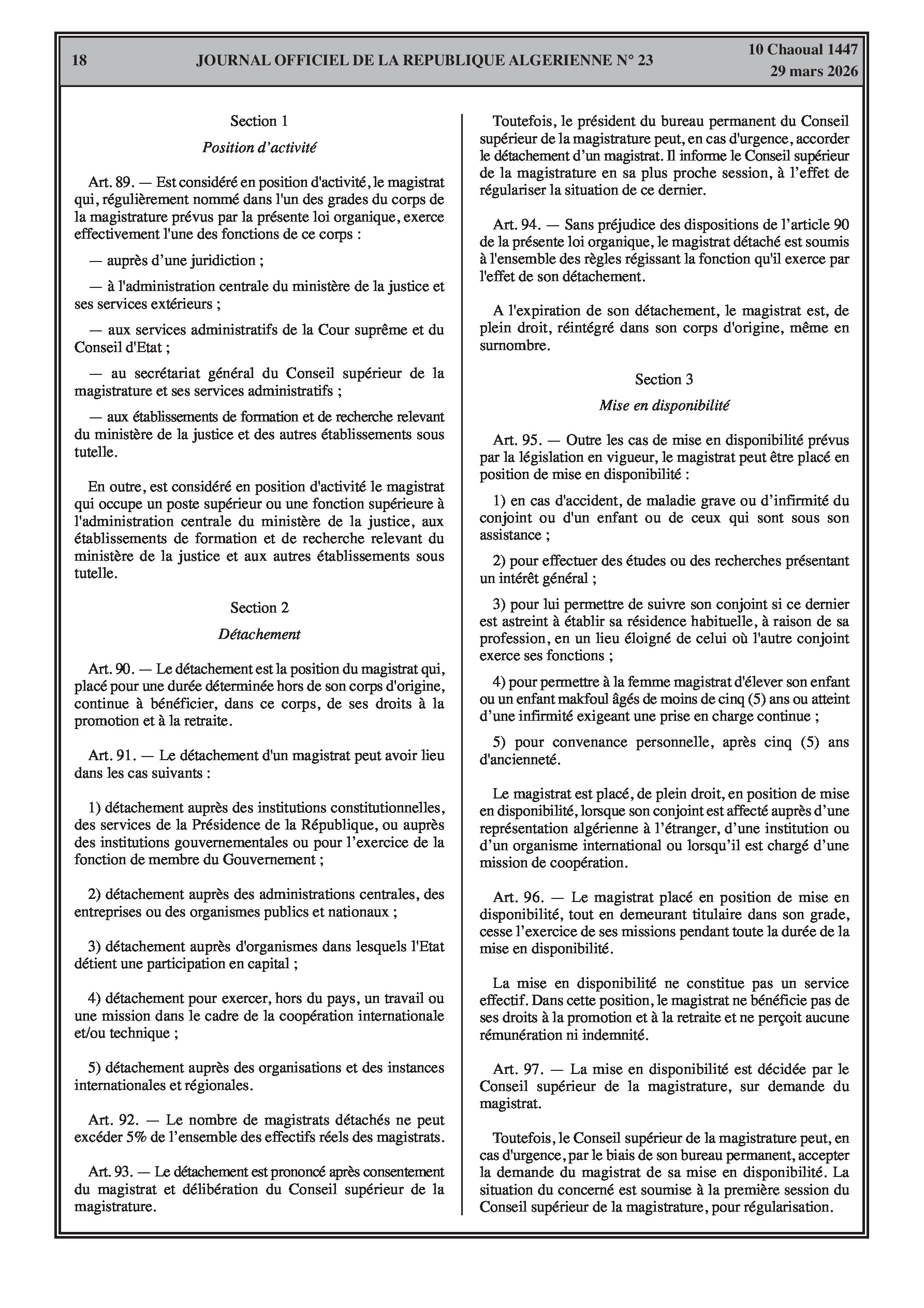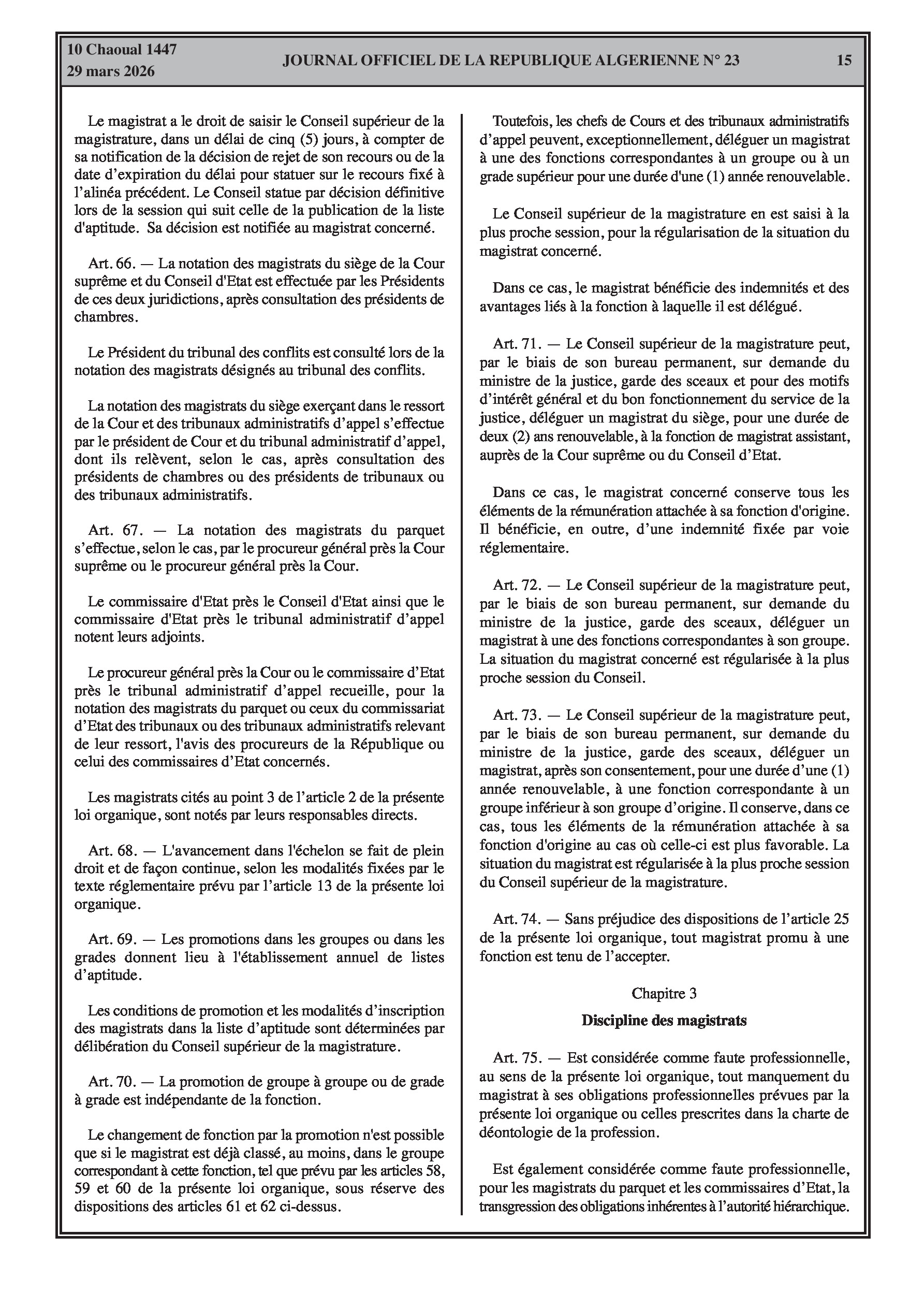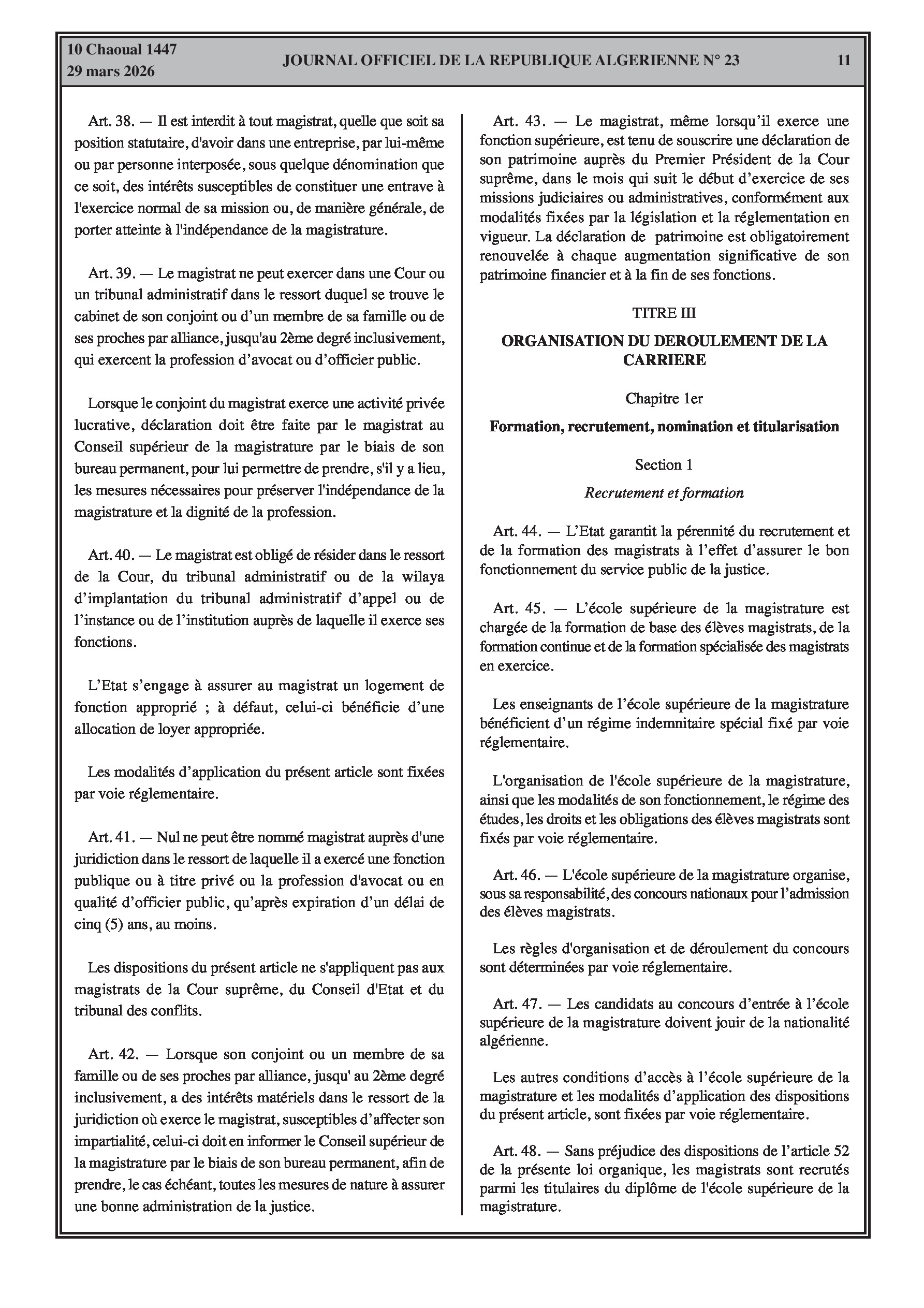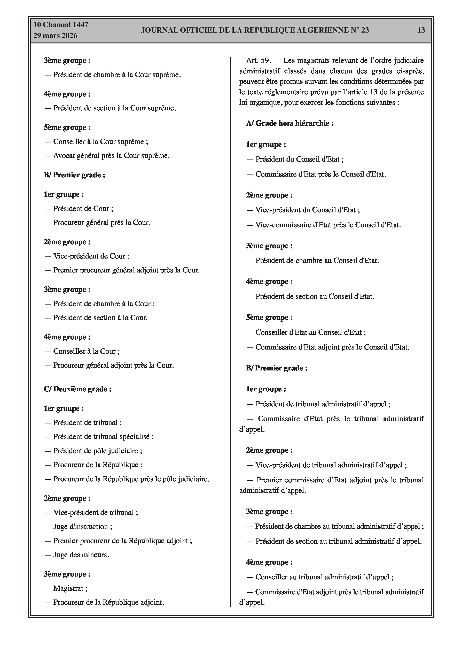 • Définition des droits, obligations et parcours de carrière des magistrats. • Inamovibilité garantie pour les magistrats du siège. • Réglementation stricte des mutations, promotions et de la discipline. • Obligation de déclaration de patrimoine pour les magistrats.