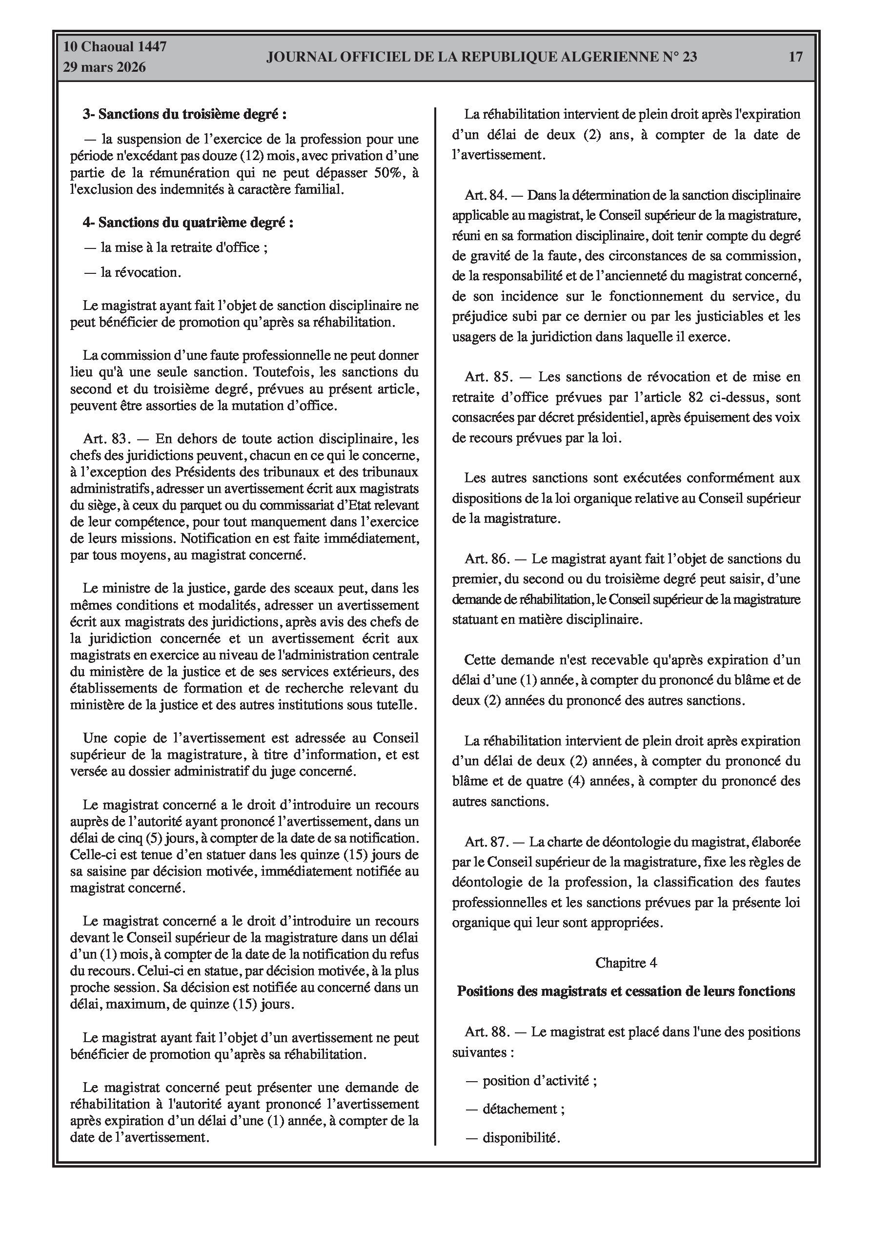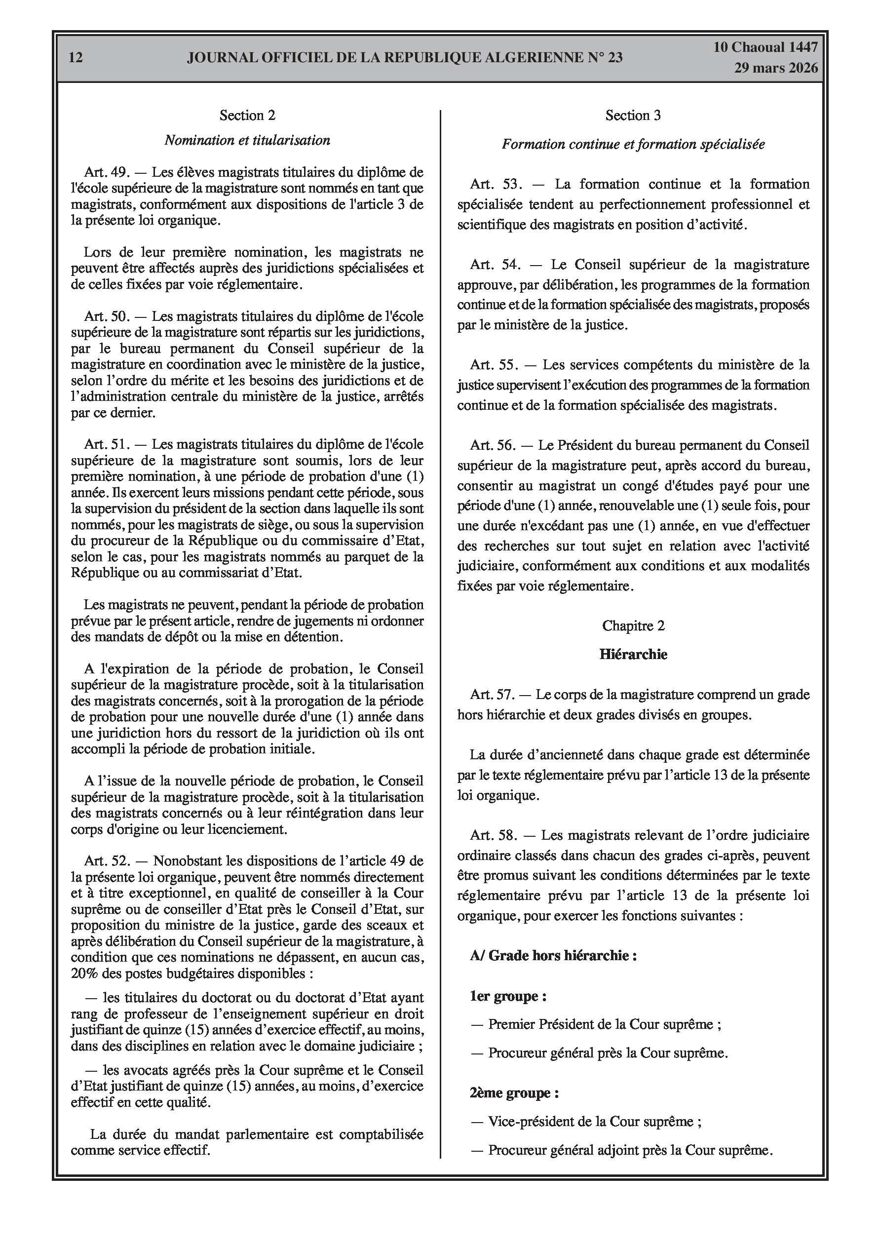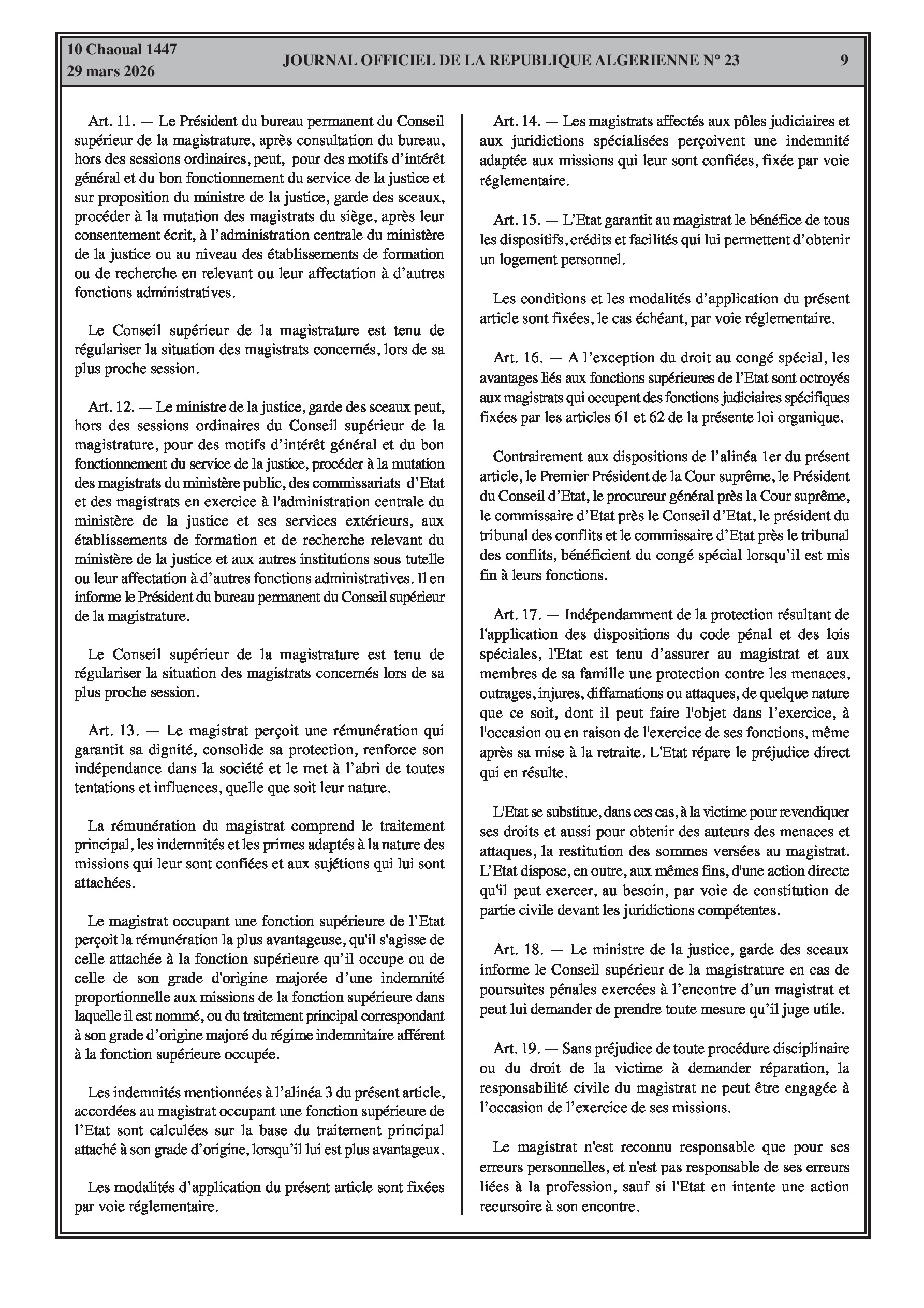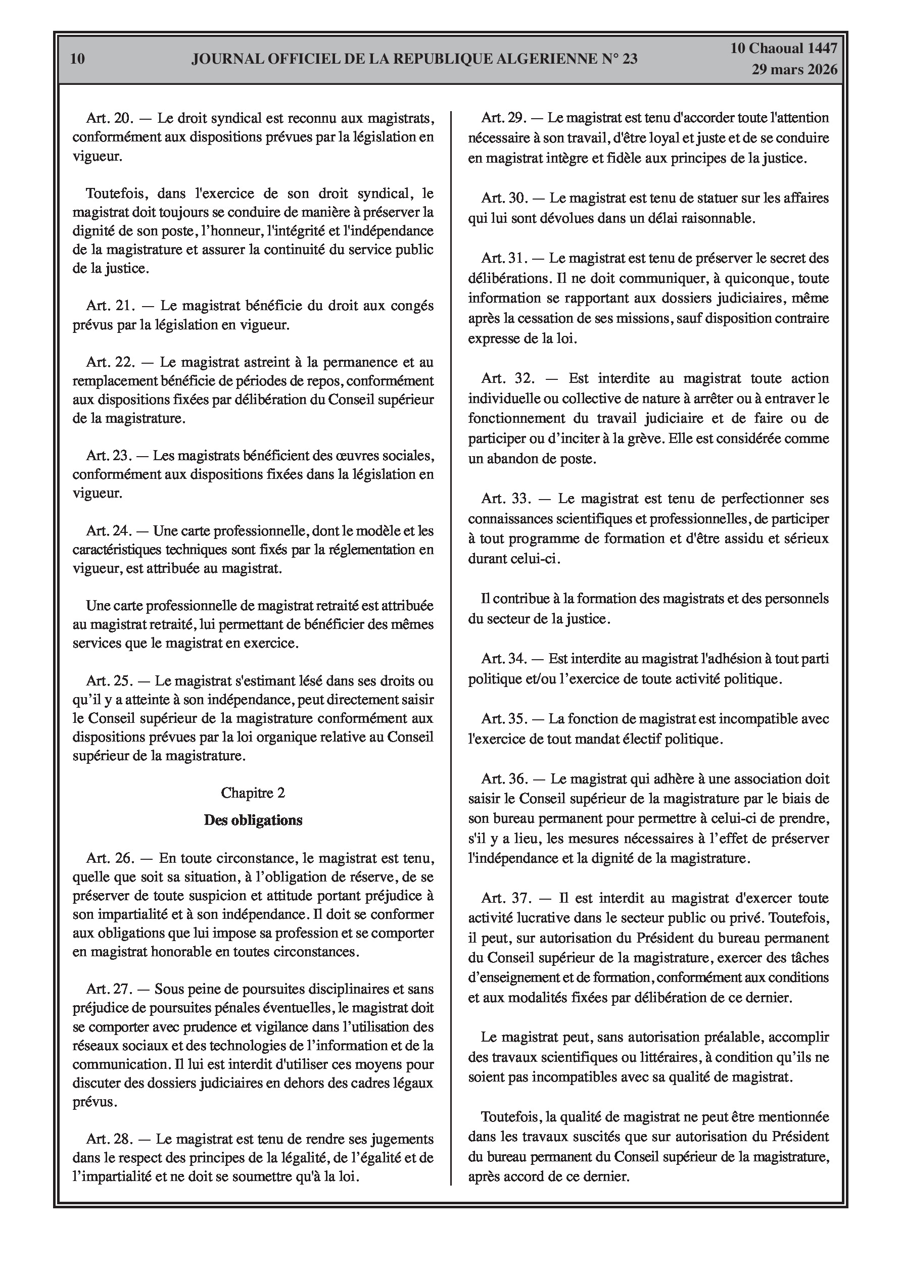• Définition des droits, obligations et parcours de carrière des magistrats. • Inamovibilité garantie pour les magistrats du siège. • Réglementation stricte des mutations, promotions et de la discipline. • Obligation de déclaration de patrimoine pour les magistrats.