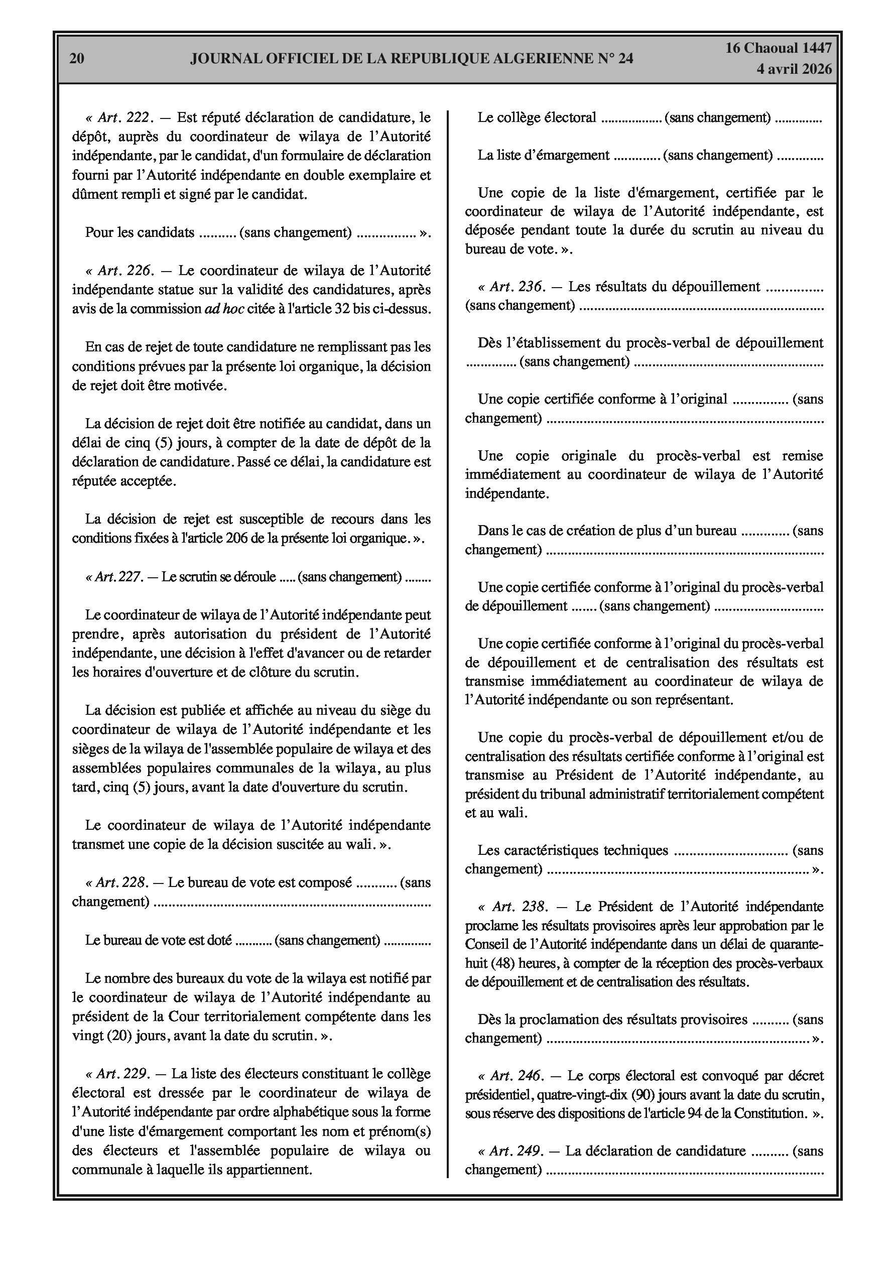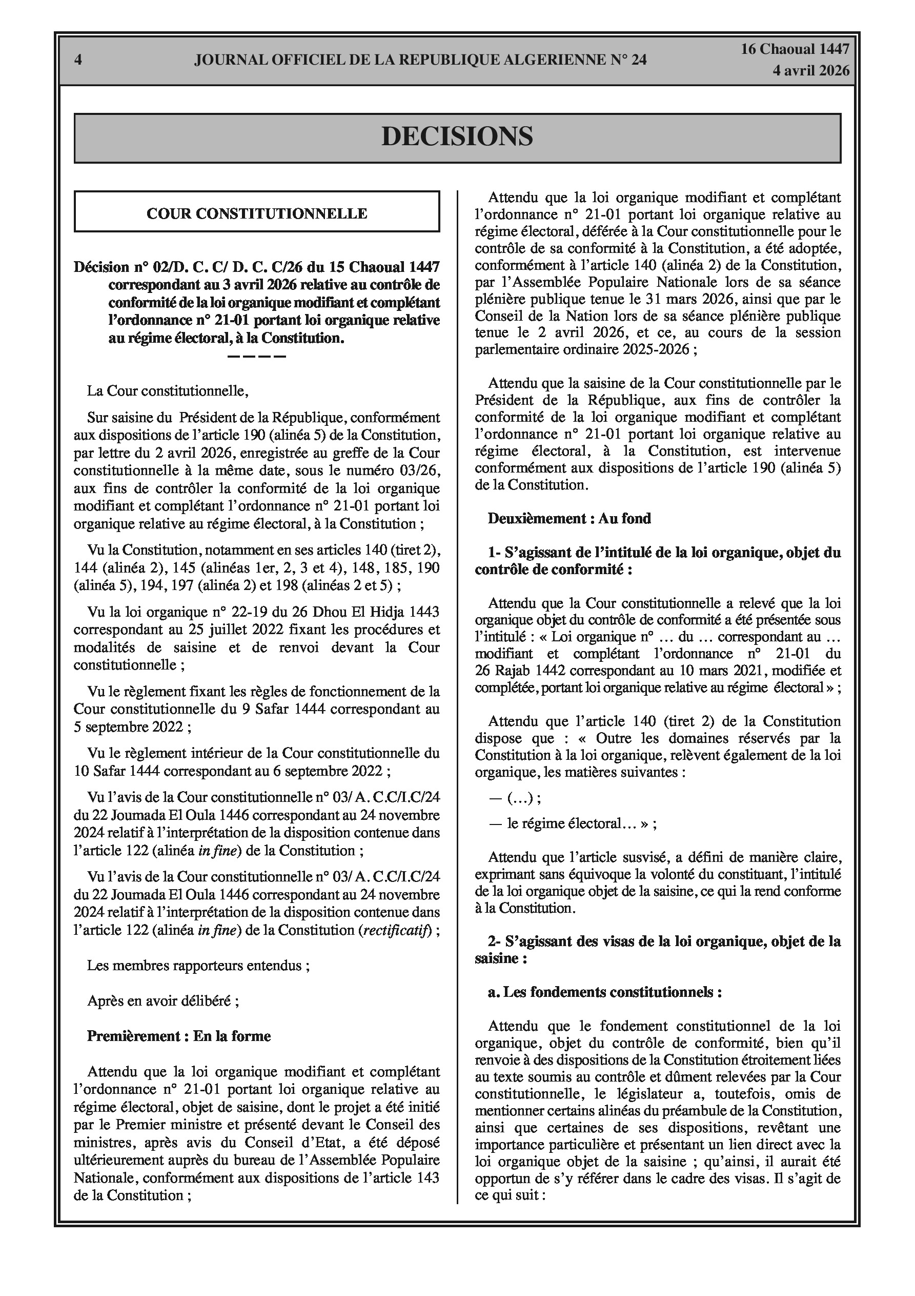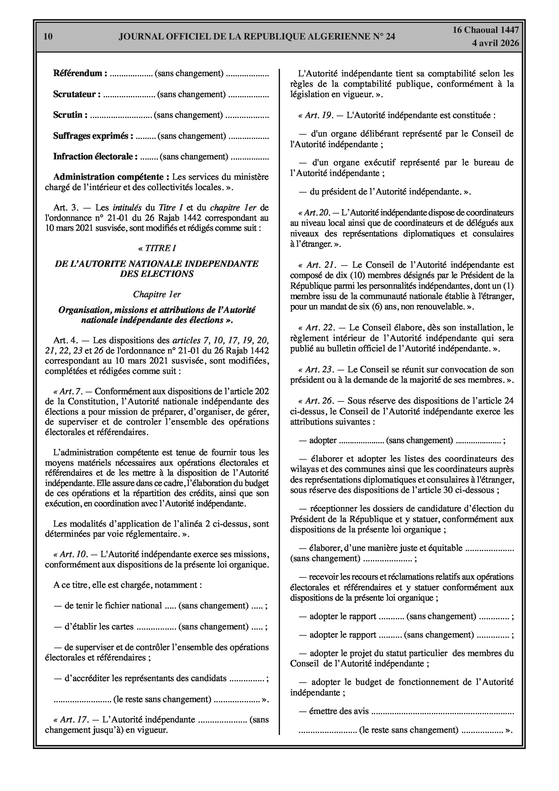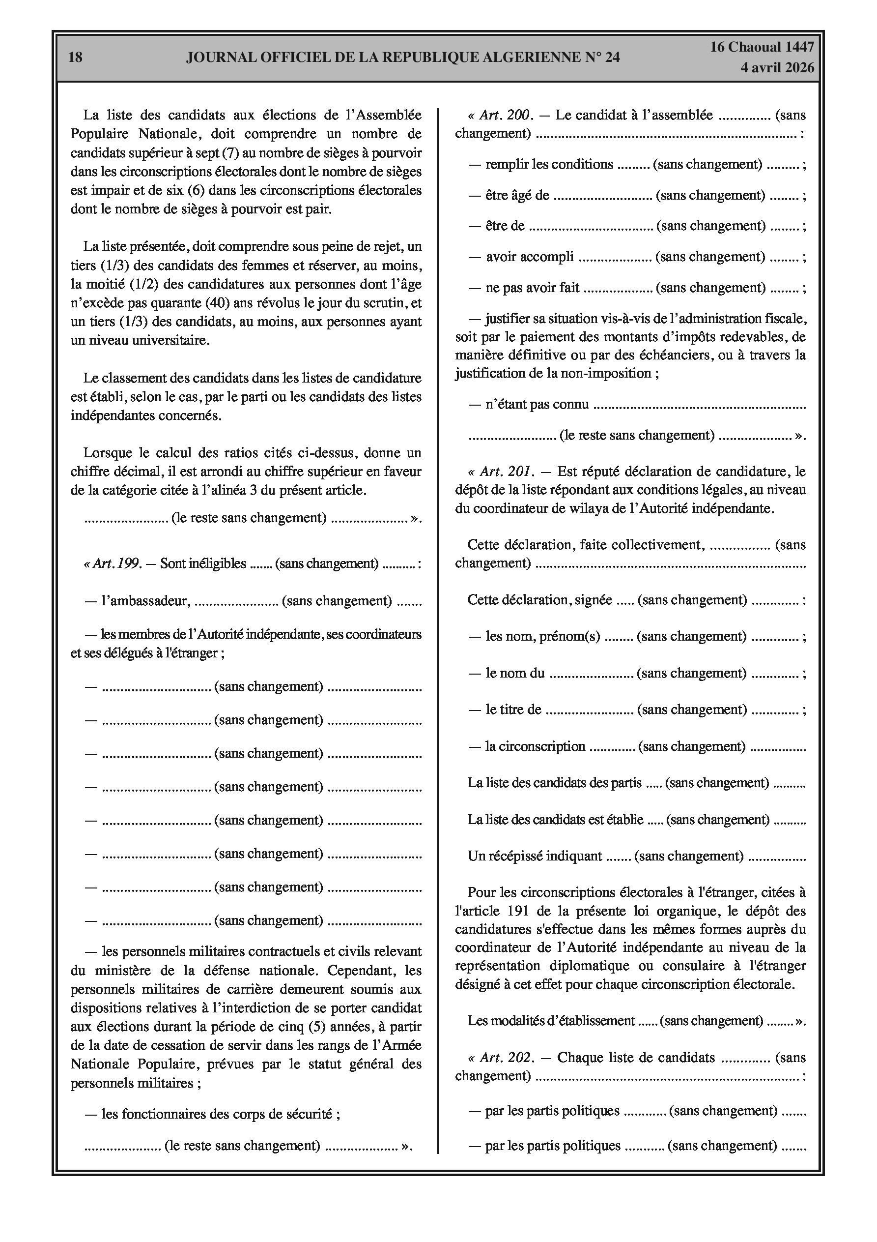 - La Cour constitutionnelle valide la loi organique modifiant le régime électoral. - La loi réorganise l'Autorité Nationale Indépendante des Élections. - Nouvelles conditions de candidature incluant des quotas pour les jeunes, les femmes et les diplômés universitaires. - Le 2 juillet 2026 est fixé pour les élections législatives.