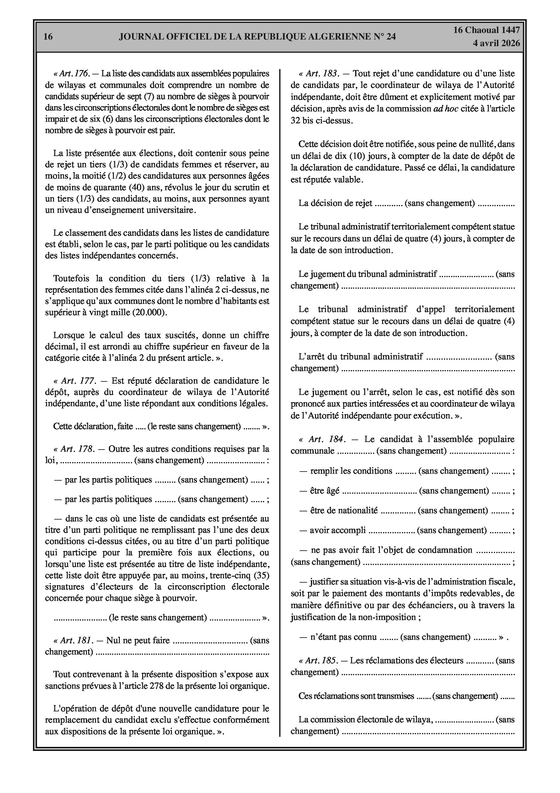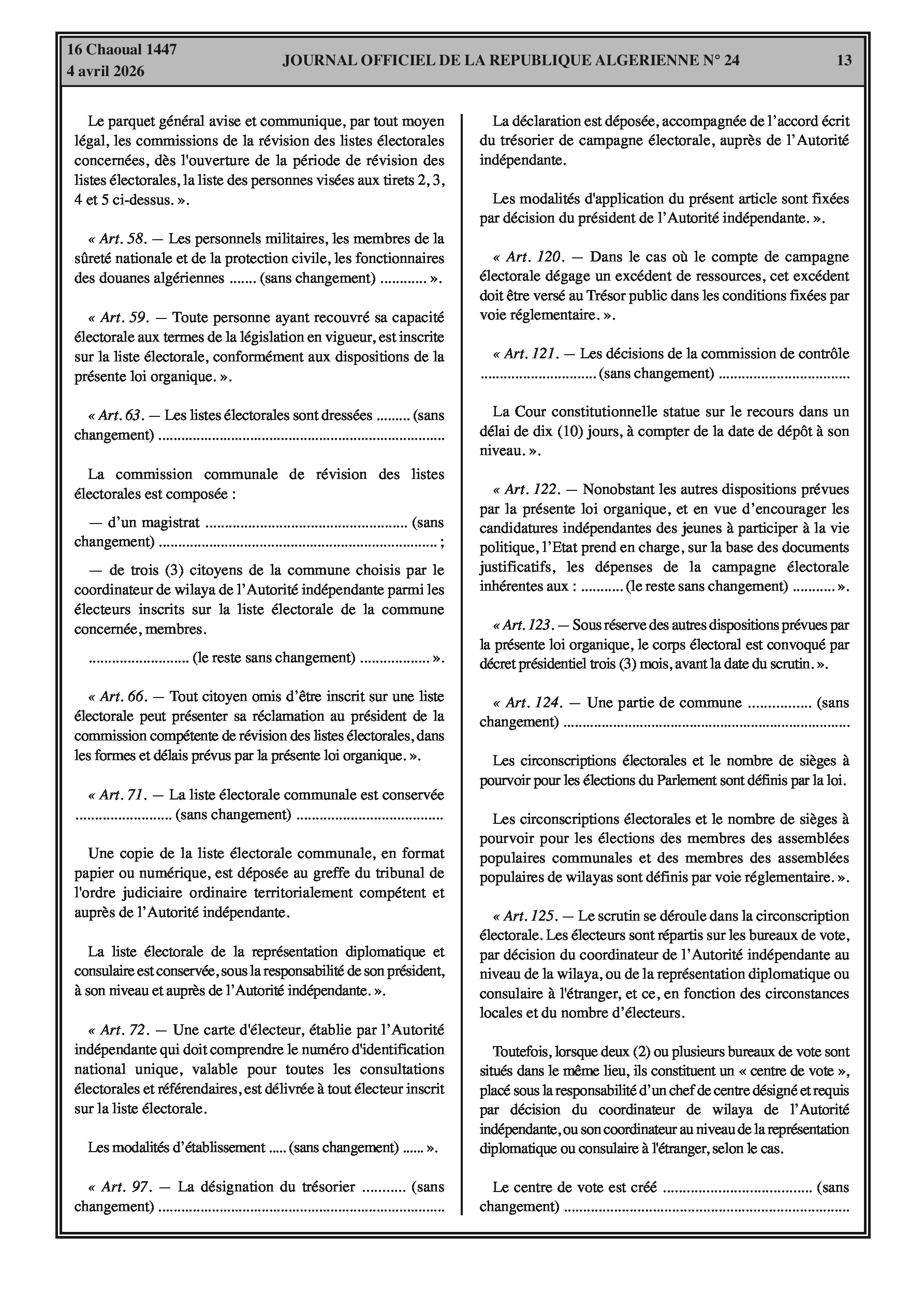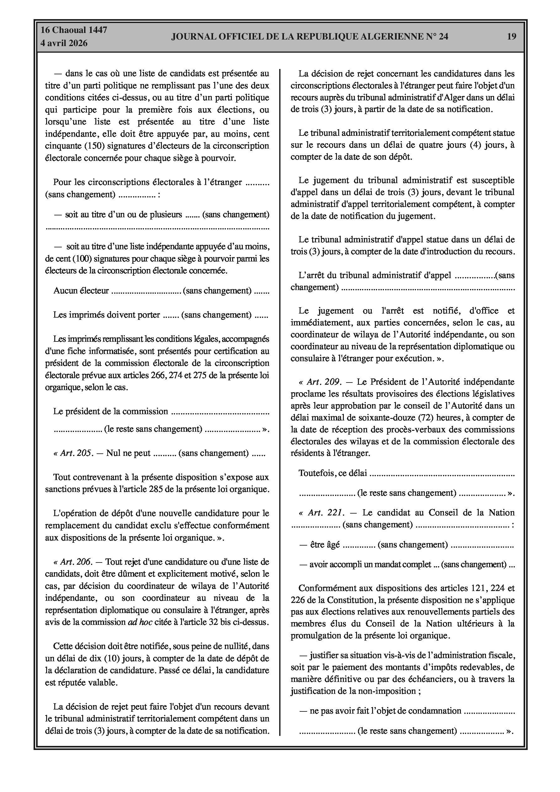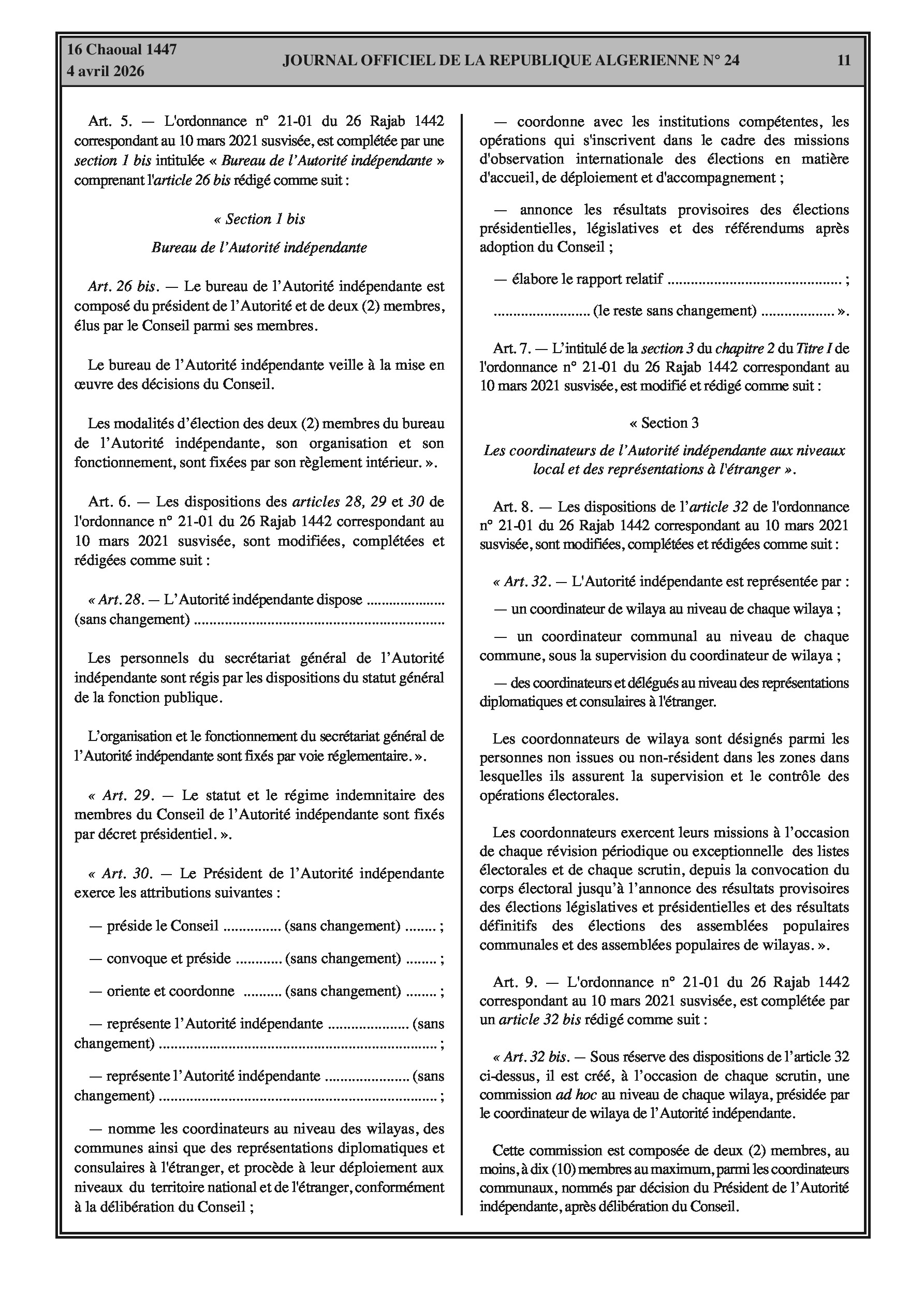 - La Cour constitutionnelle valide la loi organique modifiant le régime électoral. - La loi réorganise l'Autorité Nationale Indépendante des Élections. - Nouvelles conditions de candidature incluant des quotas pour les jeunes, les femmes et les diplômés universitaires. - Le 2 juillet 2026 est fixé pour les élections législatives.