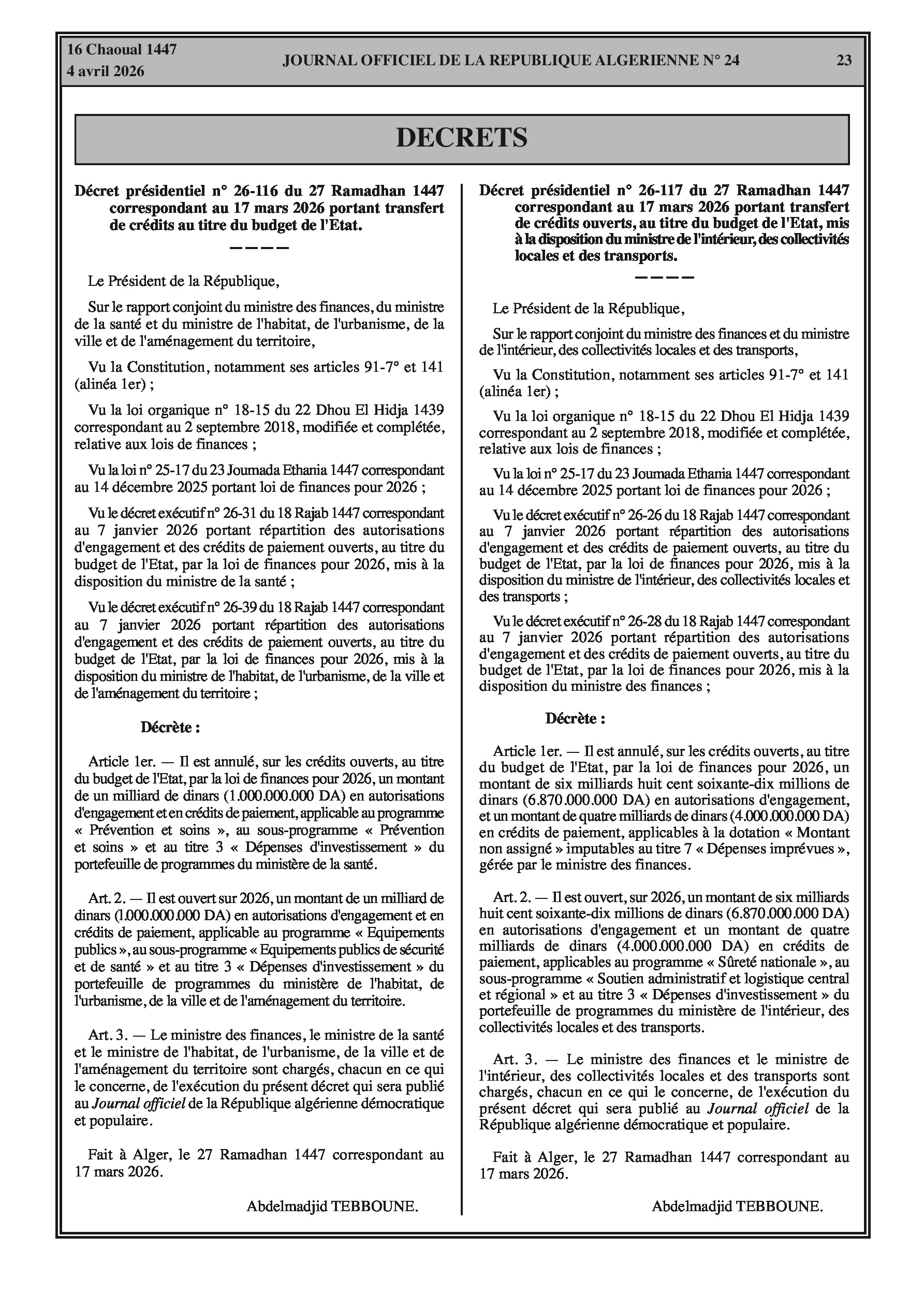 Décrets présidentiels actant le transfert de crédits budgétaires au profit de l'Habitat, de l'Intérieur et des collectivités locales.