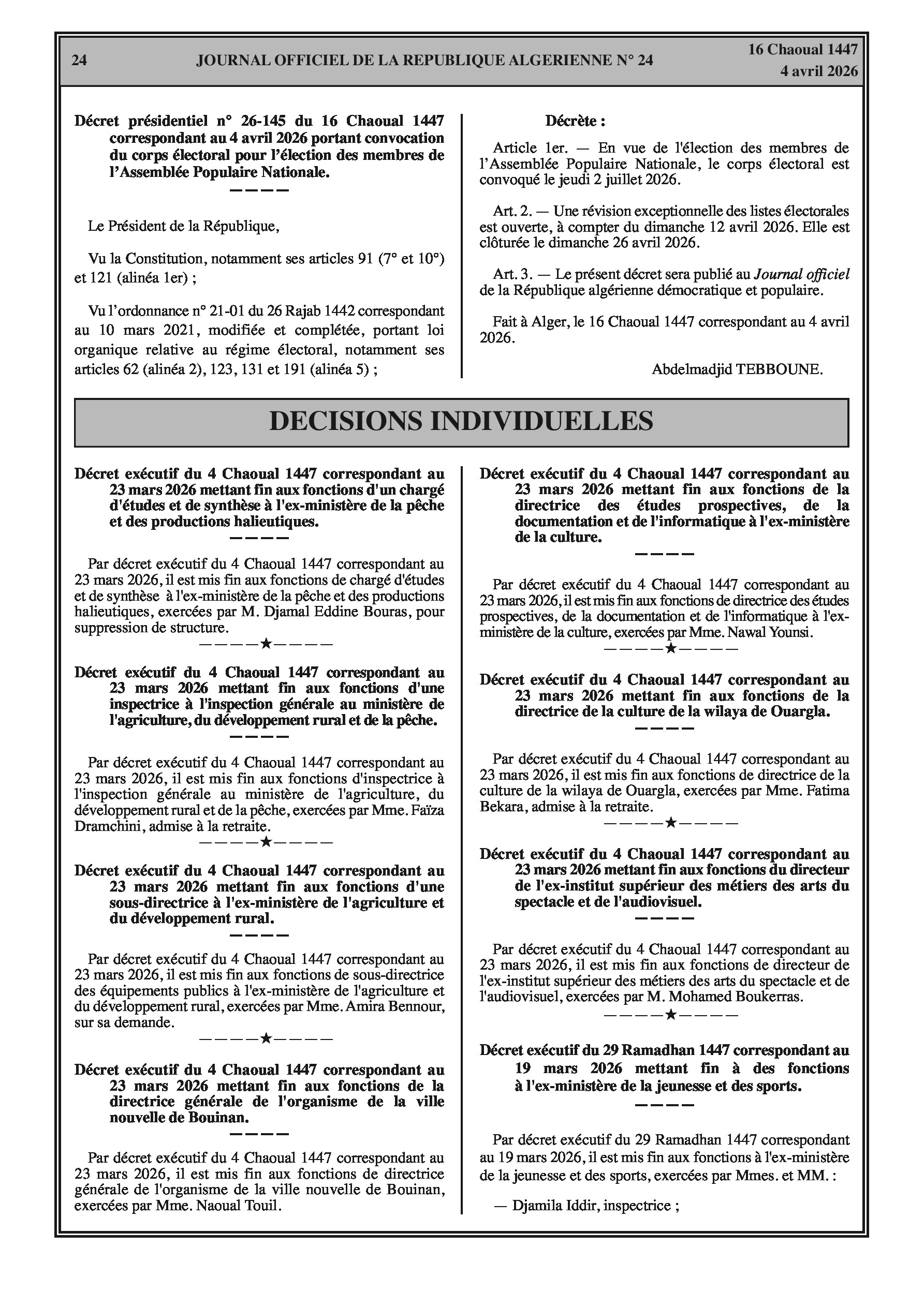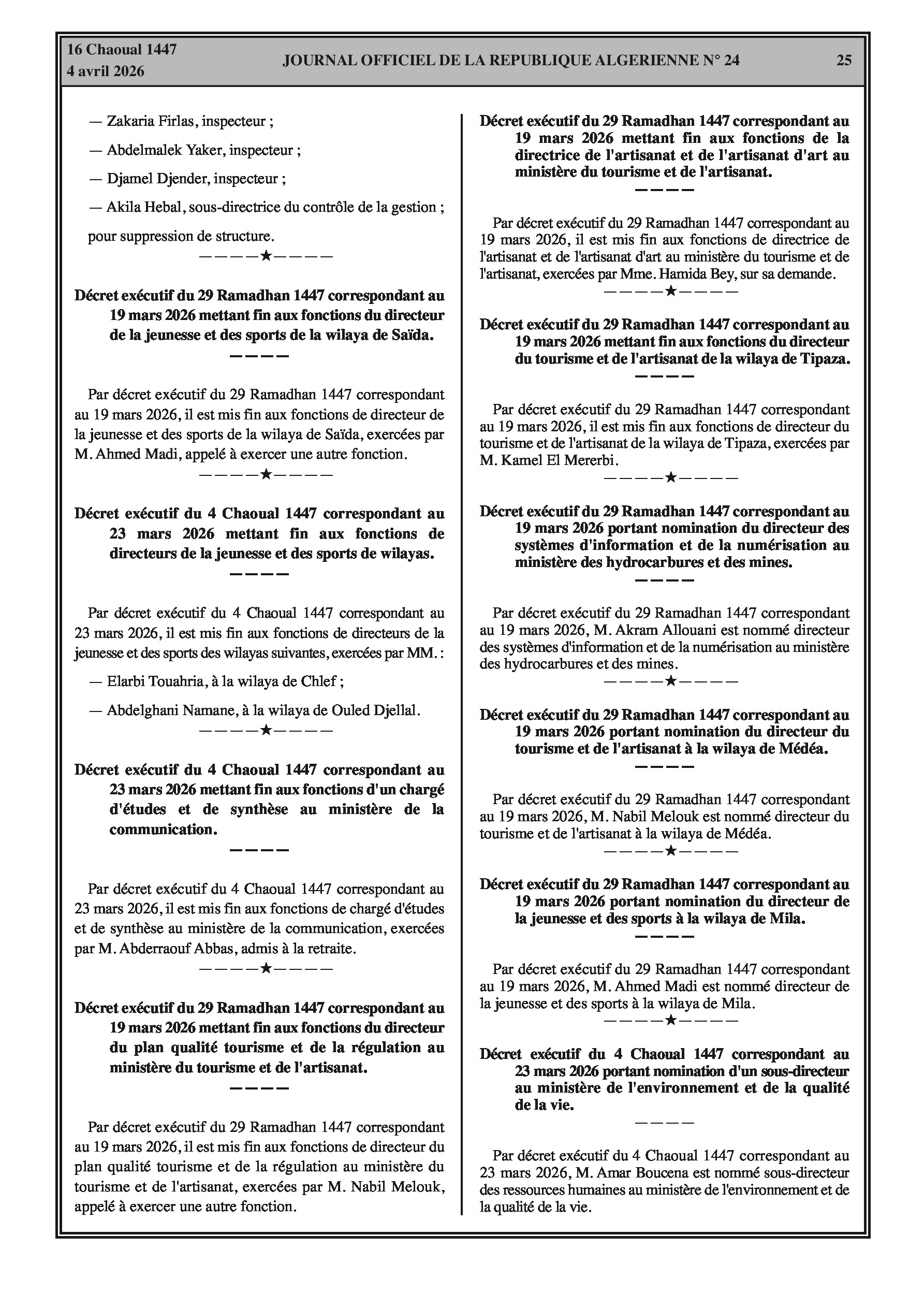 - Fins de fonctions et nominations dans les ministères de la Pêche, de l'Agriculture et de la Culture. - Nomination de directeurs de wilaya pour la jeunesse, les sports et le tourisme. - Nouvelles nominations administratives à l'Environnement et à l'Énergie.