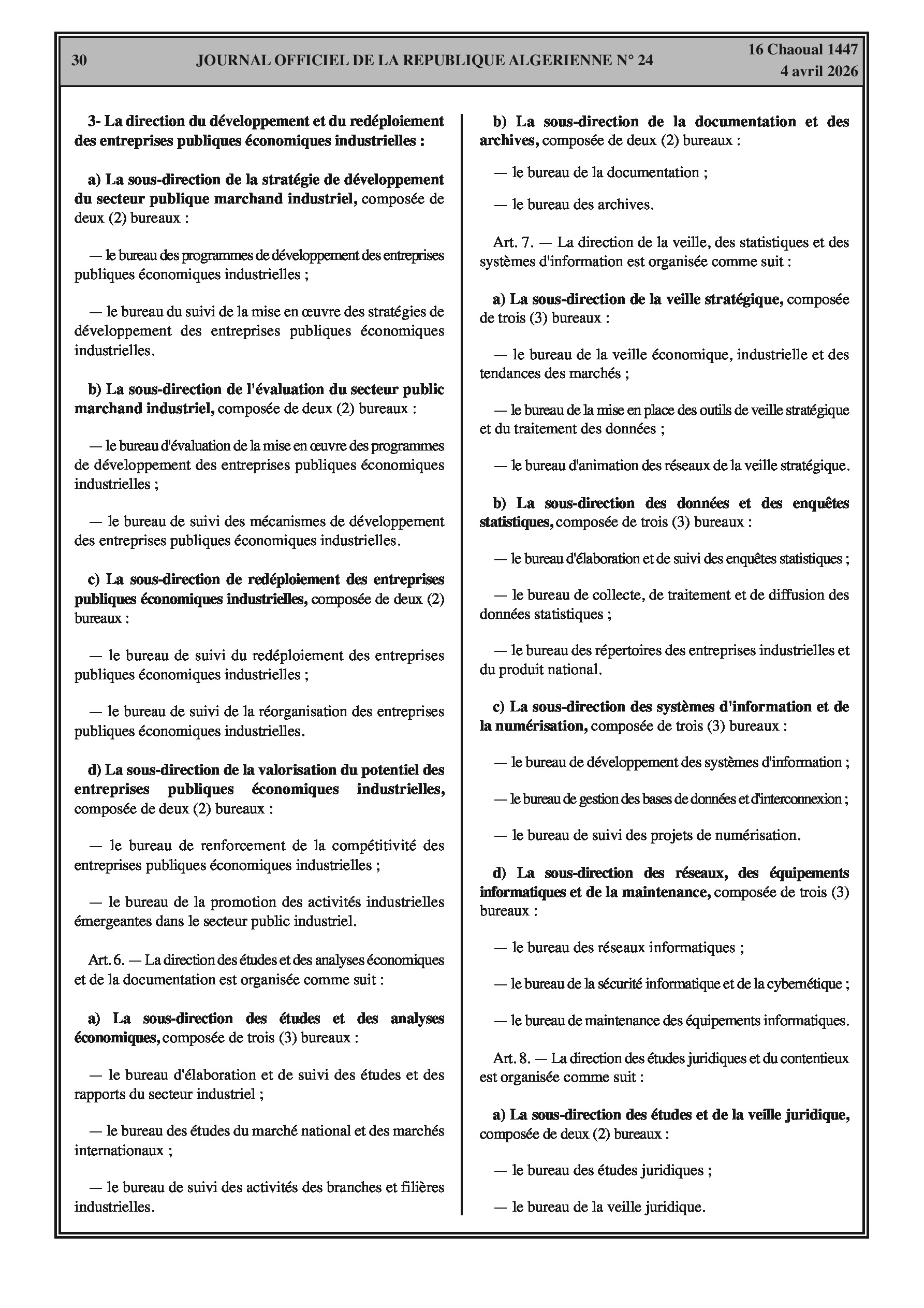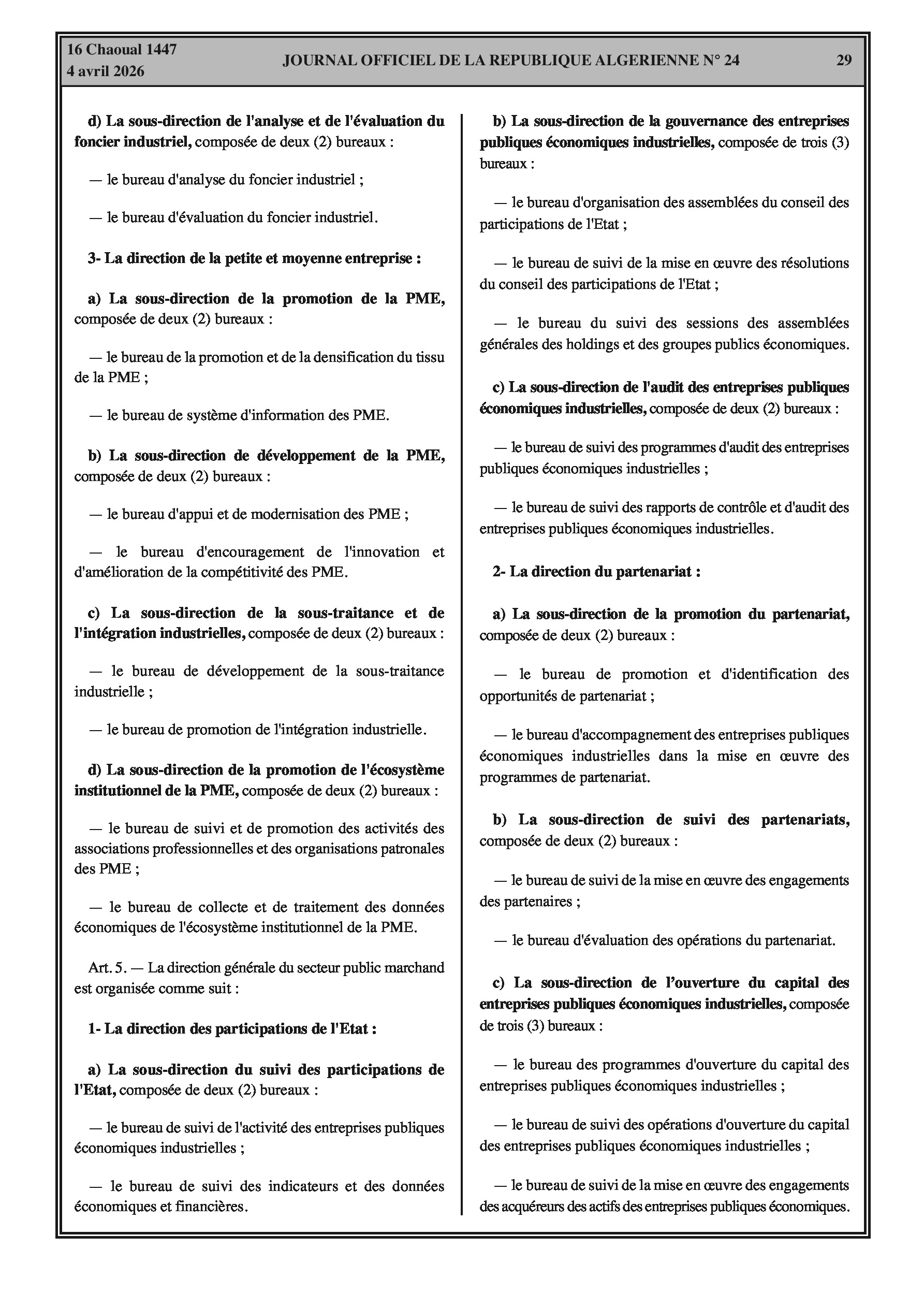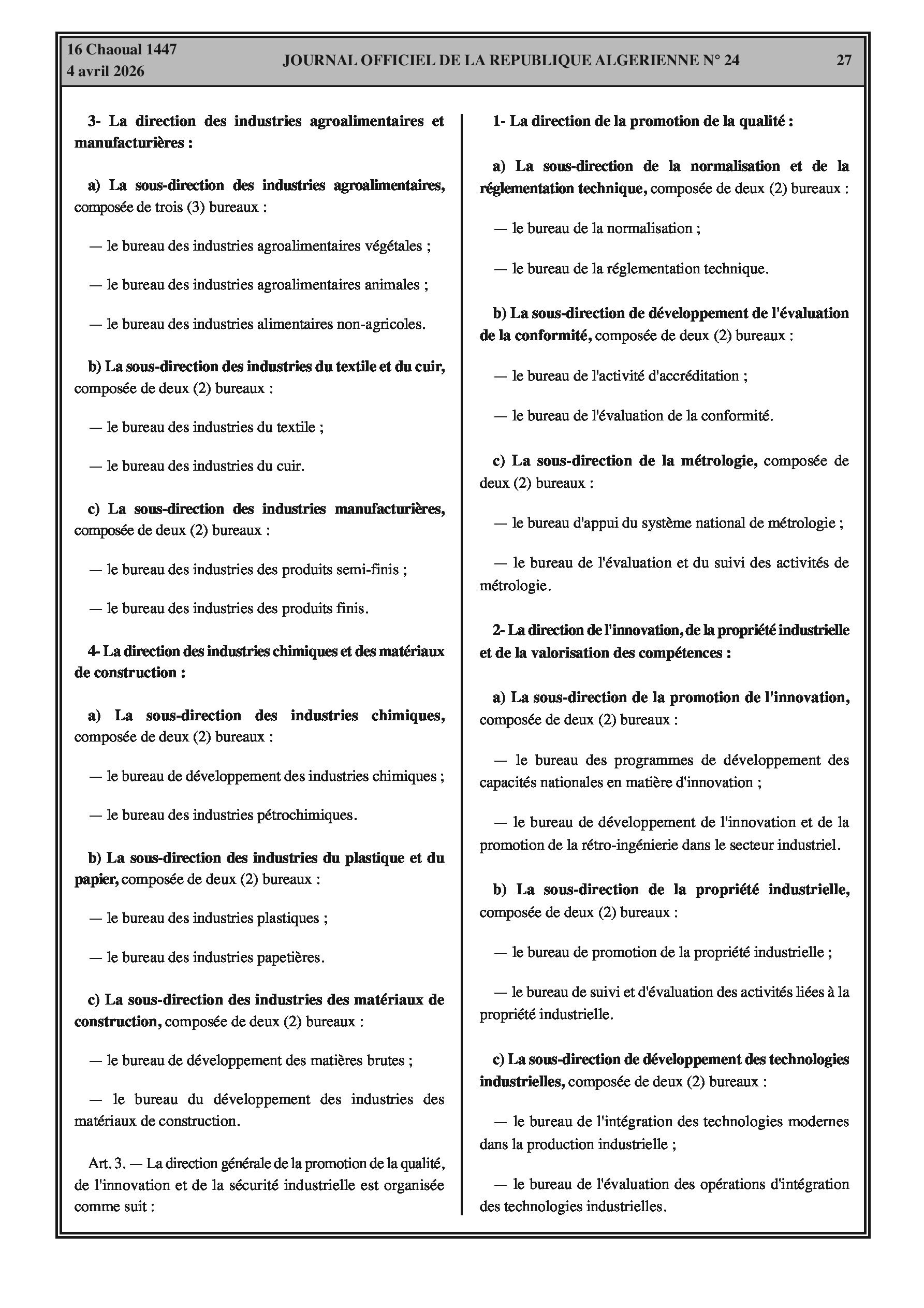 - Structuration de l'administration centrale du ministère de l'Industrie en directions spécialisées (développement industriel, qualité, investissement). - Désignation du président et des membres de la commission du prix national de la PME innovante.