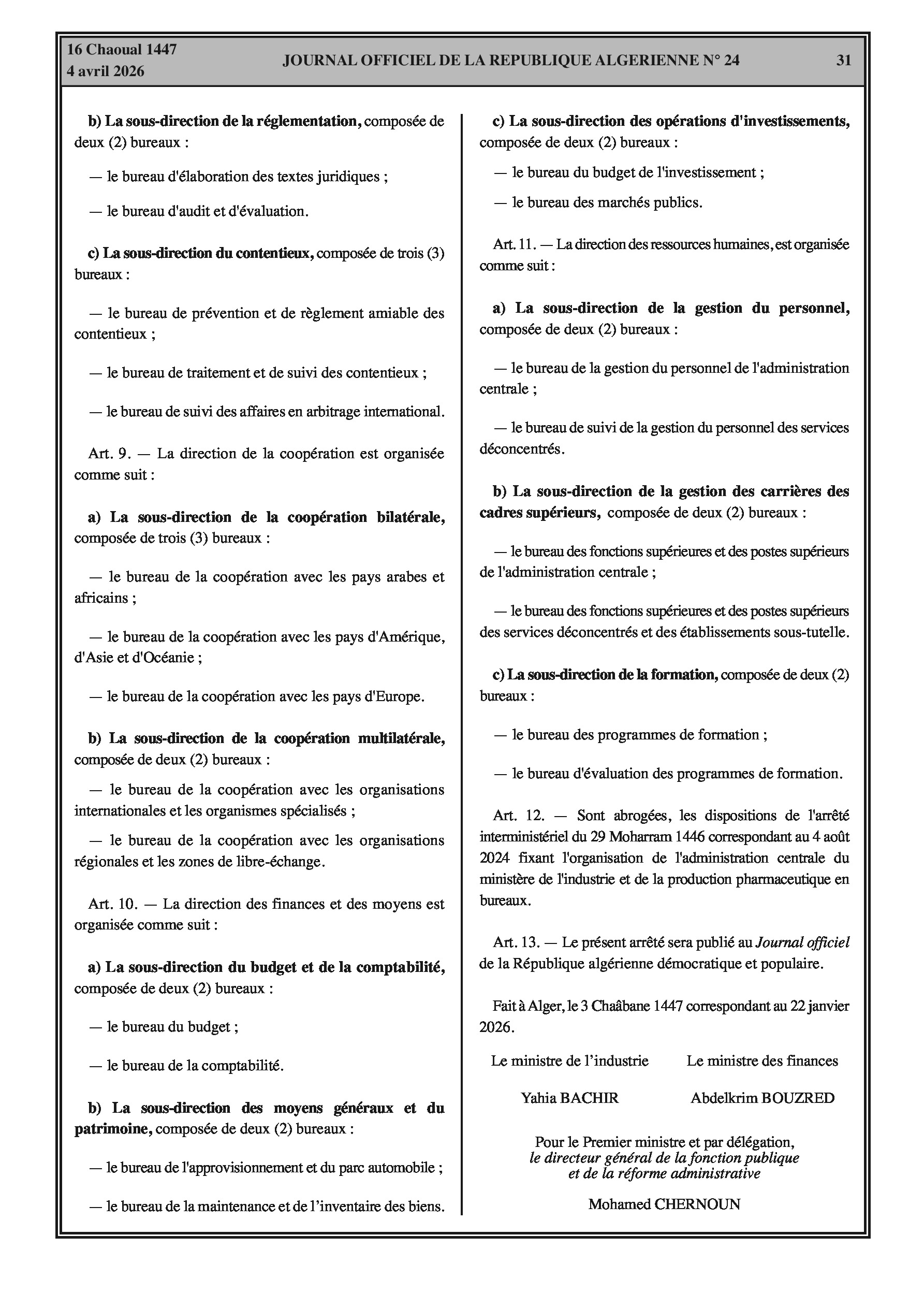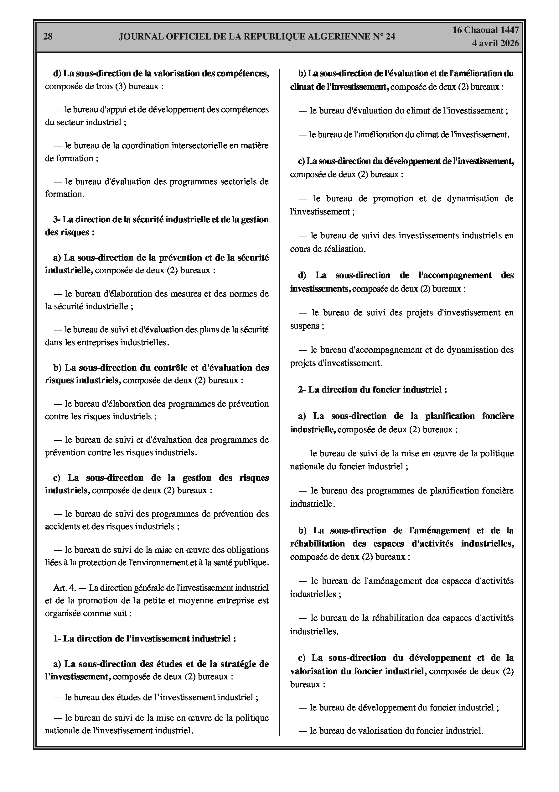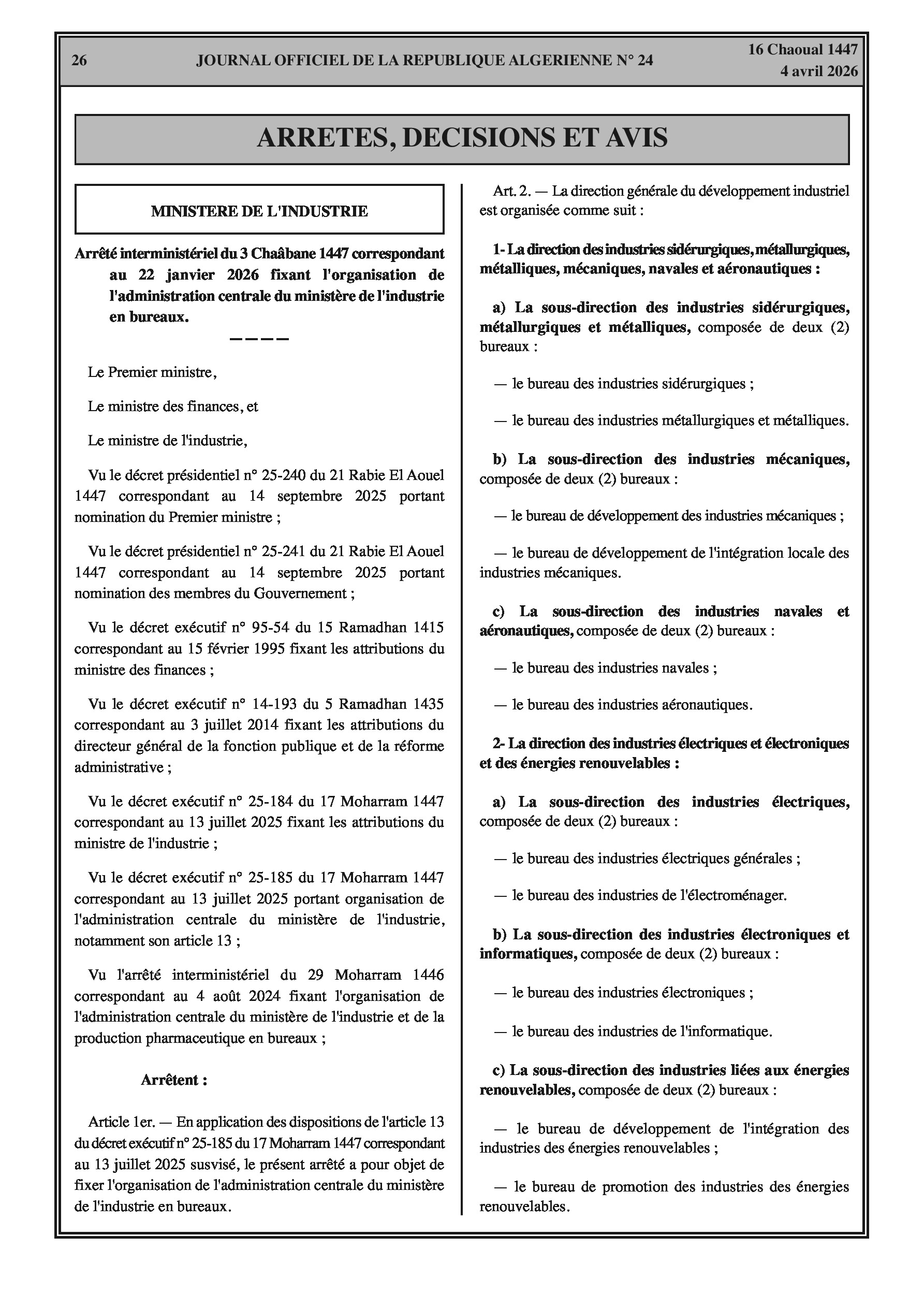 - Structuration de l'administration centrale du ministère de l'Industrie en directions spécialisées (développement industriel, qualité, investissement). - Désignation du président et des membres de la commission du prix national de la PME innovante.