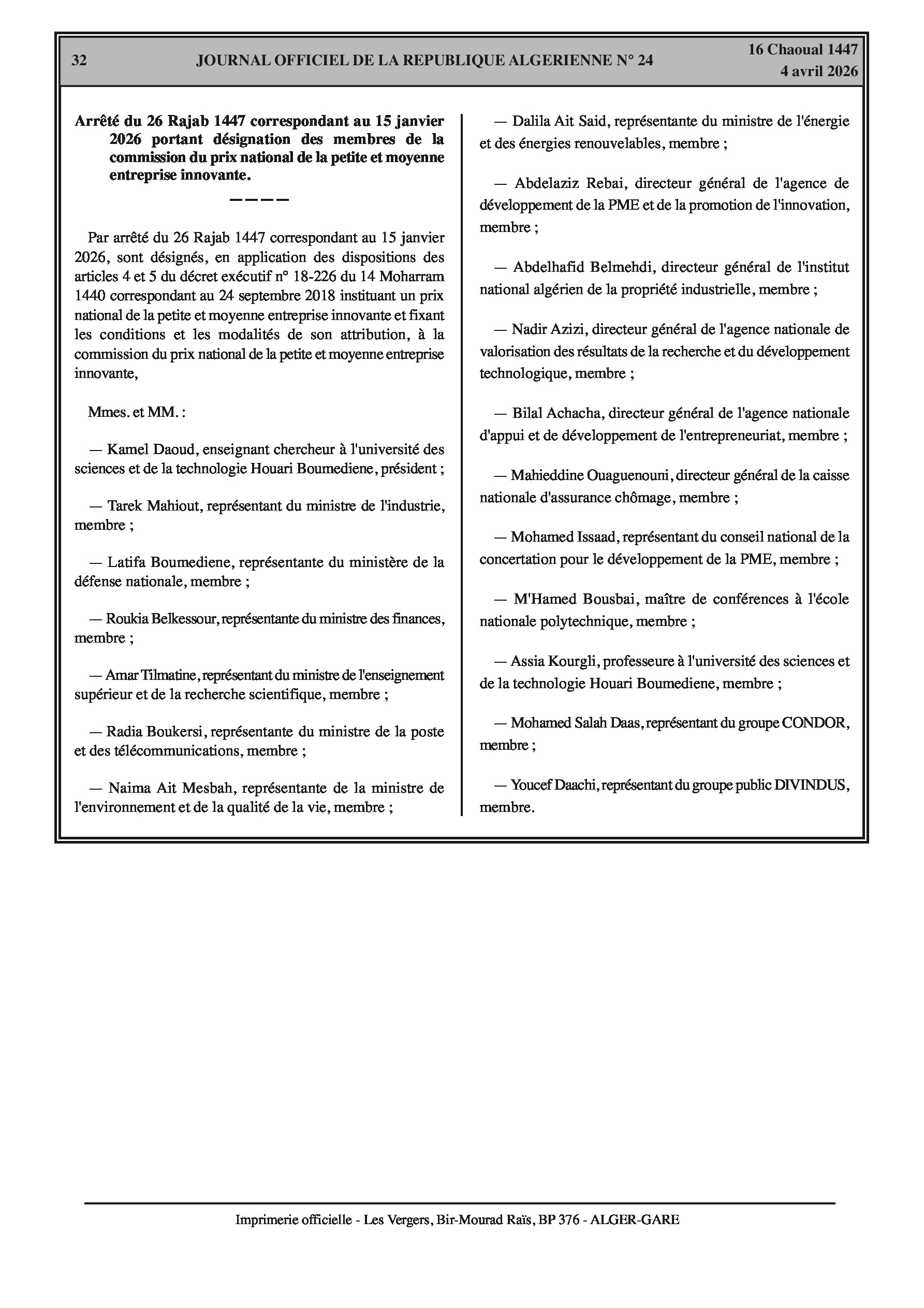 Arrêté fixant l'organisation du ministère de l'Industrie et désignation des membres de la commission du prix de la PME innovante.